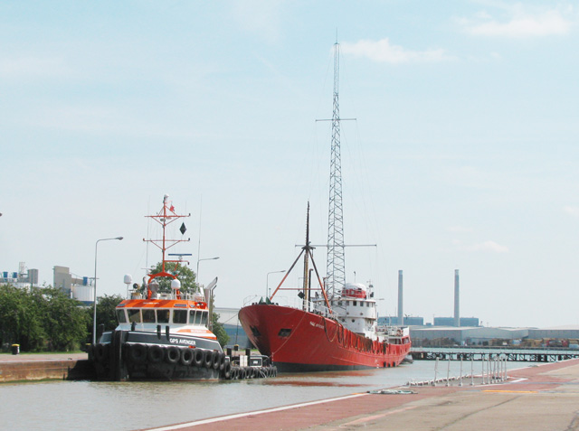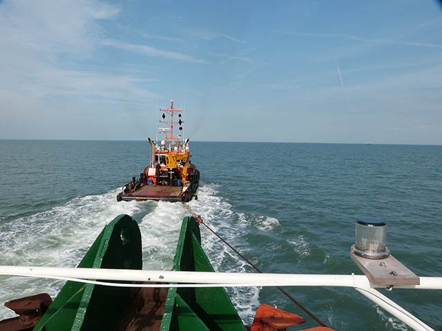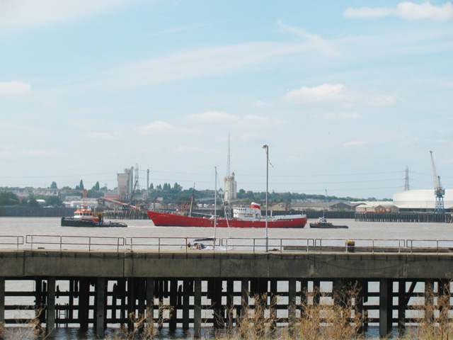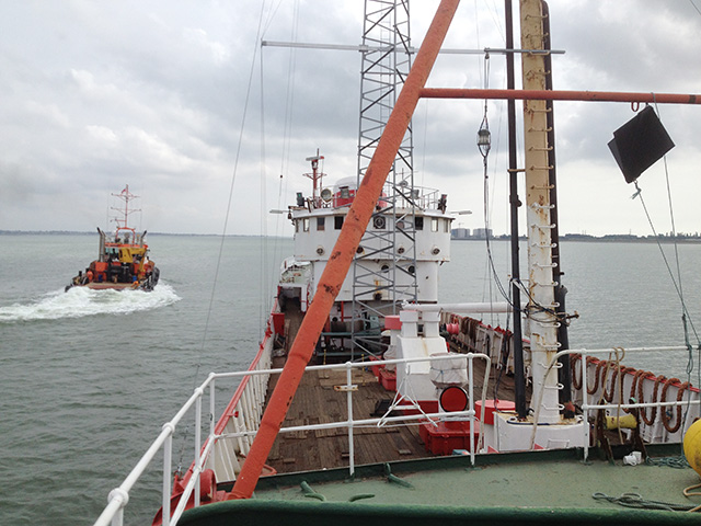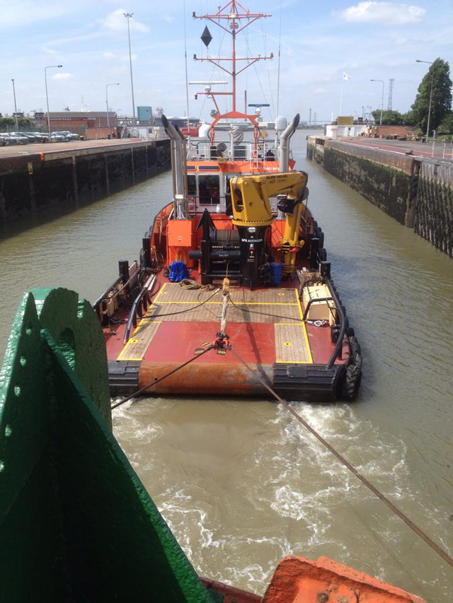 At Tilbury the Ross Revenge is hitched up to the tug GPS Avenger